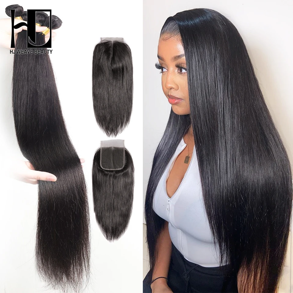 Tissage en lot brésilien Remy lisse avec Closure, extensions de cheveux naturels, 4x4, 28 30 pouces | AliExpress