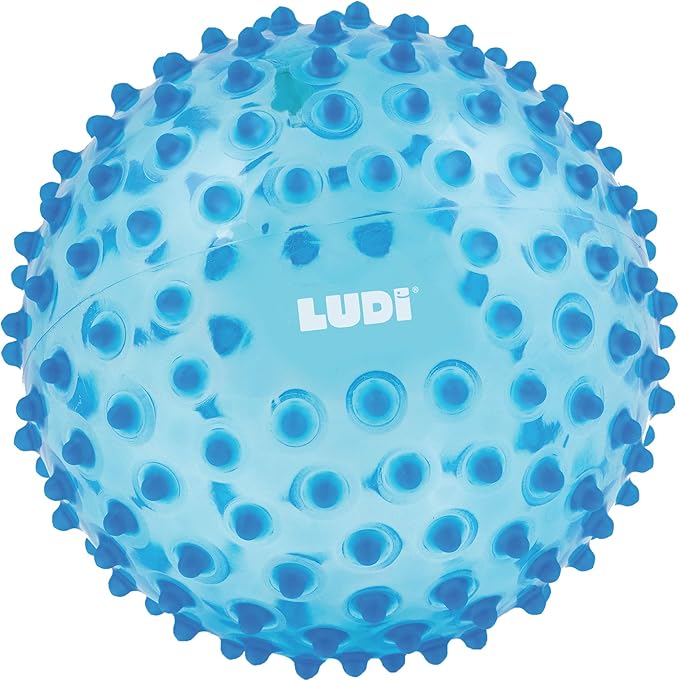 LUDI - Balle sensorielle bleue pour l'éveil de bébé. Adaptée aux enfants dès 6 mois. Gros picots tendre faciles à mordiller. Balle de jeu ou de massage. Diamètre : 20 cm -